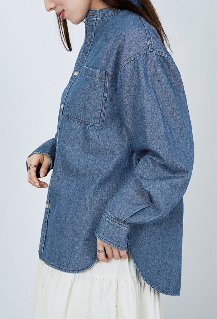 バンドカラーデザインのデニムシャツ。同系色のステッチカラーがさりげない上品さをプラスし、ユニセックスで着用できるアイテムです。羽織として合わせると抜け感のあるスタイリッシュなスタイルに。トレンドを押さえながらも飽きのこないデザインで、季節問わず大活躍。