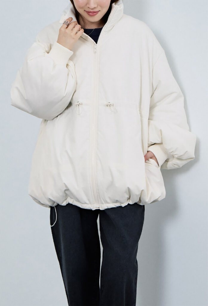 トレンド感あふれるパフィング中綿ジャケット。軽い着心地なのに袖口と襟のリブが冷気の侵入を防ぐので、真冬でも快適。裾が絞れる仕様で防寒できるだけでなく、丸みのあるシルエットでの着用もOK!ウエスト部分も絞れるので、さらにシルエットの調整もできます。