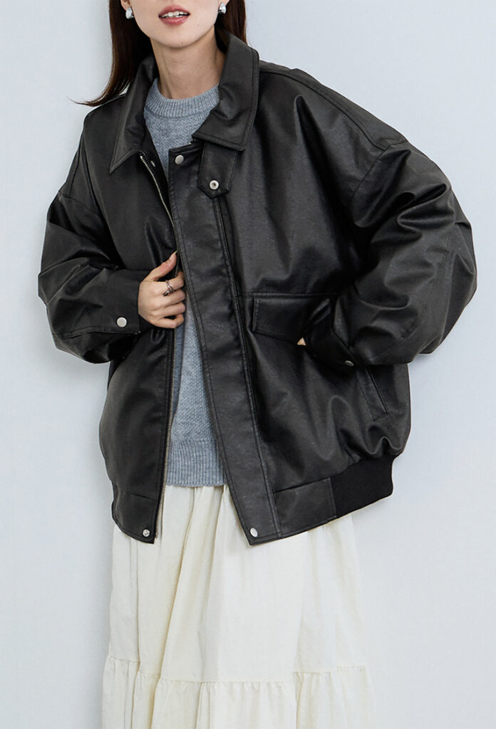 セミマットな質感と滑らかな肌触りが魅力の高見え合成皮革素材のブルゾン。ゆったりとしたシルエットで、メンズライクなコーディネートはもちろん、ふんわりとしたロングスカートと合わせて甘辛ミックスのスタイリングにもピッタリ!トレンド感を引き立てる万能アイテムです。