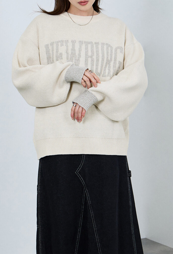 フロントに施された大きめのロゴが程よい存在感を放ち、トレンド感のあるスタイルを演出。袖口に施された配色リブがアクセントとなり、シンプルながらも印象的なデザインに。ゆるっとしたサイズ感のニットで絶妙なシルエットの大人カジュアルが完成。