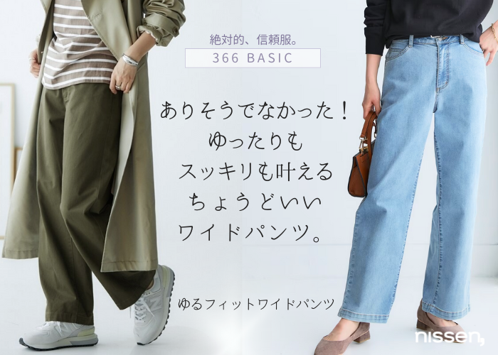 ゆったりなのにスッキリ見える絶妙なシルエットで、シリーズ累計30万枚を突破。快適さと美しさを両立した、ニッセンの定番パンツ。豊富なサイズ展開とレングス展開なので、きっとピッタリが見つかる。
